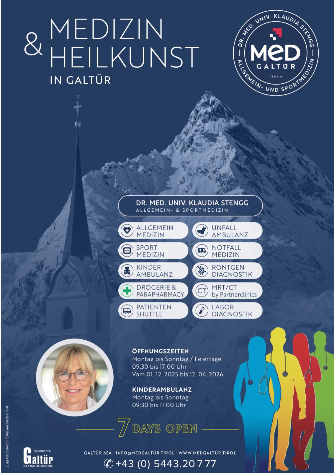 INFOPOSTMED Galtür ÖffnungszeitenDie Ordination MED Galtür hat in der Wintersaison 2025/2026 vom 1. Dezember 2025 bis 12. April 2026 7 Tage die Woche geöffnet. Öffnungszeiten Allgemein und Sportmedizin Montag bis Sonntag und an Feiertagen Öffnungszeiten Kinderambulanz Montag bis Sonntag |